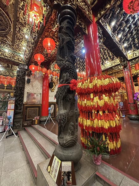 慈鳳宮にある2本の龍柱は、清朝時代の作と言われ、福建省・泉州でとれた「壓艙石(あんそうせき)」という白石でつくられています。壓艙石でつくられた柱は、台湾でも13対しかなく、たいへん珍しいものです。壓艙石は、昔中国から台湾に船で渡るとき船の底に入れて、波の強い海でも船が安定するためのおもりとしたもので、台湾に着いてからは寺廟の建材として使われました。慈鳳宮の2本の龍柱は、かつて漢民族が台湾にやってきて、この土地で新しい暮らしを始めた歴史を物語っています。